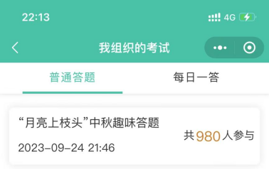 答题内容主要围绕中秋节的历史渊源、文化习俗、诗词歌赋等方面设置题目,旨在通过趣味答题的形式,让同学们感受中华传统节日的文化内涵。活动得到同学们的积极参与,980名同学通过线上形式参与答题,35名同学通过线下形式参与。根据答题成绩,评选出一等奖1名、二等奖2名、三等奖3名。