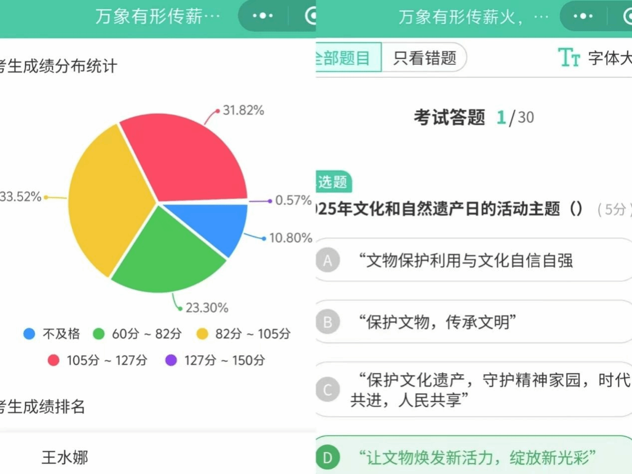 此次线上知识挑战赛,远不止于一场简单的答题活动。它成功搭建了一个生动、高效的学习平台,让文化遗产知识“活”起来、“动”起来。同学们在挑战中提升了文化认同感和自豪感,更点燃了以实际行动守护历史馈赠、传承文明薪火的热情。学院助学部表示:“希望通过这类活动,吸引更多青年学子关注、热爱并投身于文化遗产保护事业,增强当代青年的文化自信与历史担当。”