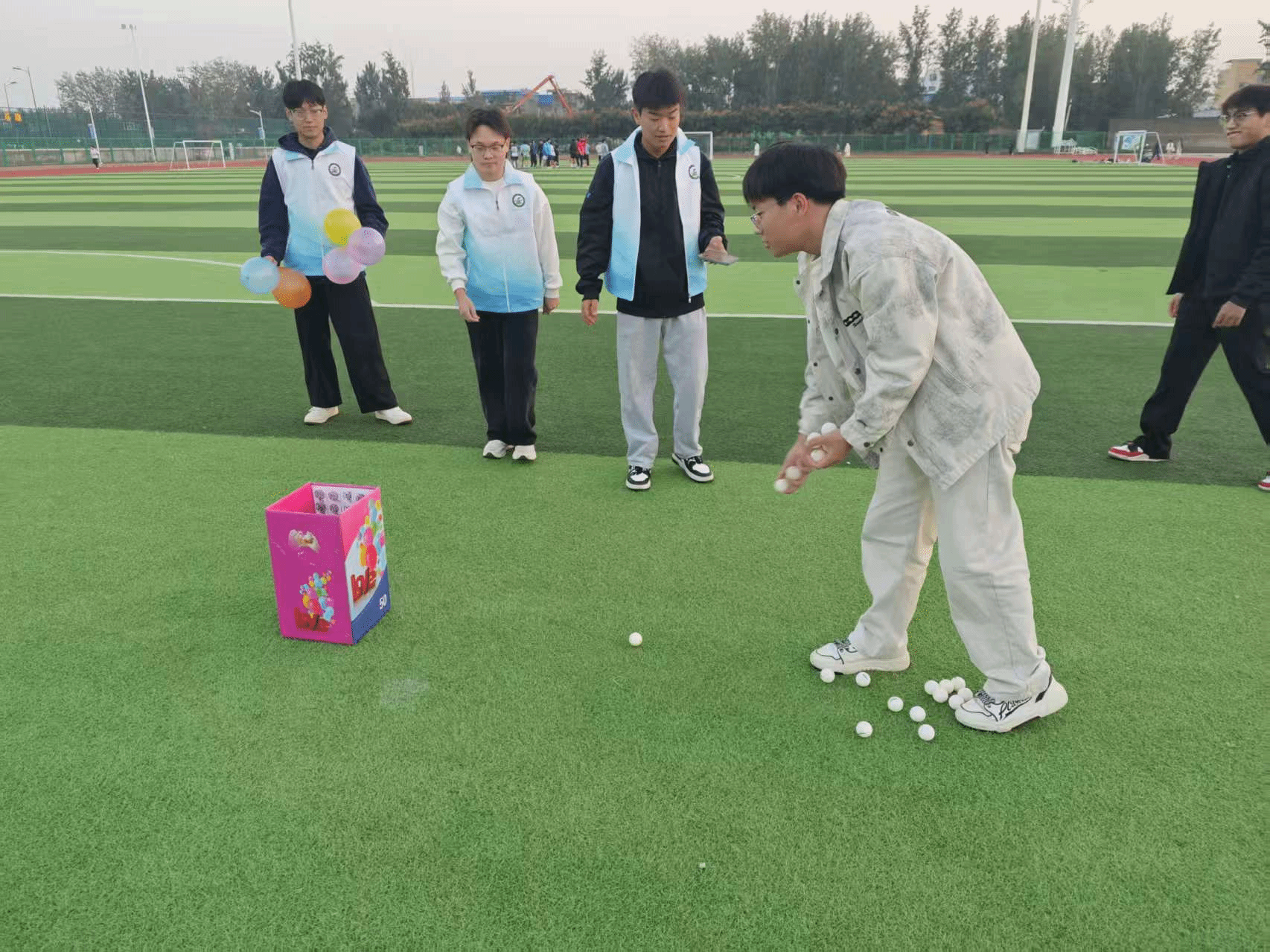 活动旨在通过轻松愉快、富有趣味的比赛形式,点燃同学们的运动热情,锤炼团队协作能力,传递健康生活的积极理念。比赛共设三项趣味环节,分别为“踏浪击瓶赛”“纸箱三分大赛”以及“稳运乾坤赛”。参赛选手以两人为一组,协同完成整场接力挑战。从敏捷击倒锥形桶,到精准投掷乒乓球,再到背对背默契夹球冲刺,每一环节不仅考验选手的个人技巧,更彰显团队的配合与信任。活动现场气氛高涨,掌声、笑声、助威声此起彼伏,青春的活力在秋日阳光下熠熠生辉。