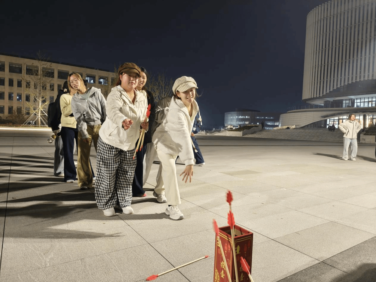 “诗韵重阳,知识大闯关”作为首关,以诗词与民俗为题,引导同学们在思索与应答间走进重阳的文化内核。“遥知兄弟登高处,遍插茱萸少一人”等经典诗句的诵读,不仅是对记忆的唤醒,更是对传统情感的共鸣。“投壶问鼎,福运登高”环节还原古礼之趣。同学们凝神屏息,执矢投壶,在一次次尝试中体味古人礼仪风范,也在欢声笑语中传递着节日的喜悦。“圈住重阳,福运连连”则将民俗游艺带入现场。五彩缤纷的福圈划出弧线,也圈出同学们对美好生活的向往。技巧与运气并重,轻松中见真情,热闹中蕴祝福。最后一关“重阳祈福·时空胶囊计划”将整场活动推向情感的高潮。同学们在便签上认真书写对亲友的牵挂、对未来的期许。这些心愿既可投入“祝福盲盒”与他人交换温暖,也可封存为“时光信件”,待来年重阳重启,见证成长与心愿的延续。