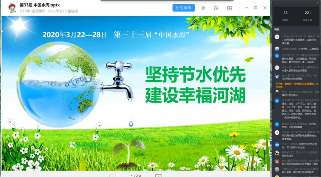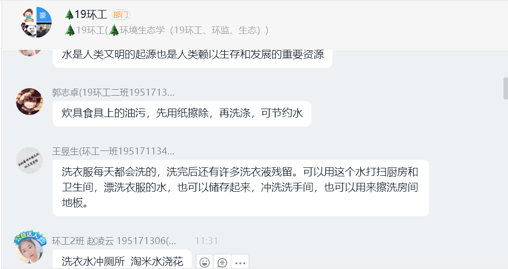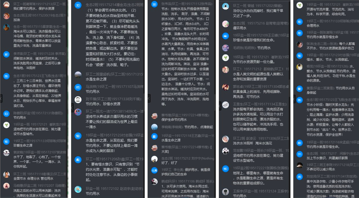 活动紧扣主题,形式多样。一是任课教师董晓明结合正在开展的网课《环境生态学》教学内容,向19级环工、环境监测、生态班学生介绍水法律、环保及节水、水与生态、河湖保护治理与河长制等相关知识,组织六个班221名学生在线学习讨论;二是在全系广大学生中开展以“节水、爱水、护水”为主题的手抄报、绘画、拍视频、朗诵等活动。目前,已收到各类作品62件,宣传活动还在继续进行中。