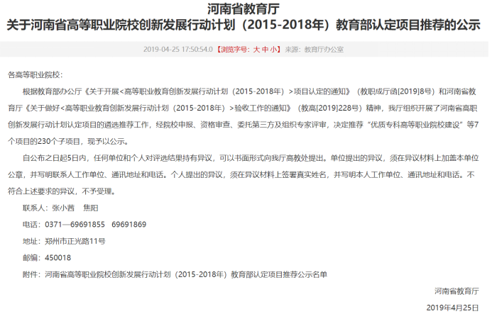 4月25日,河南省教育厅发布《关于河南省高等职业院校创新发展行动计划(2015-2018年)教育部认定项目推荐的公示》,我系牵头申报和建设的“环境工程技术协同创新中心”项目获得教育部认定。